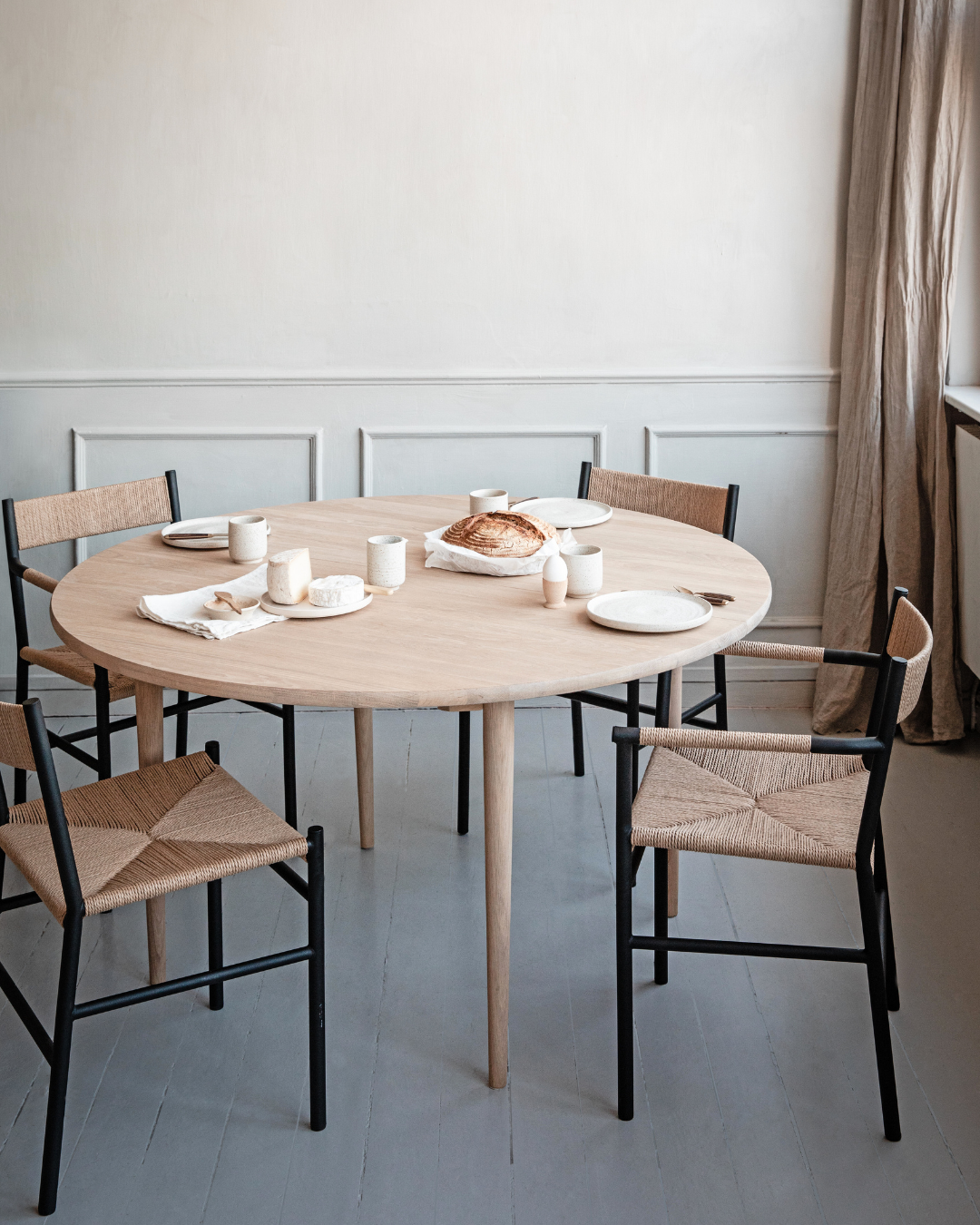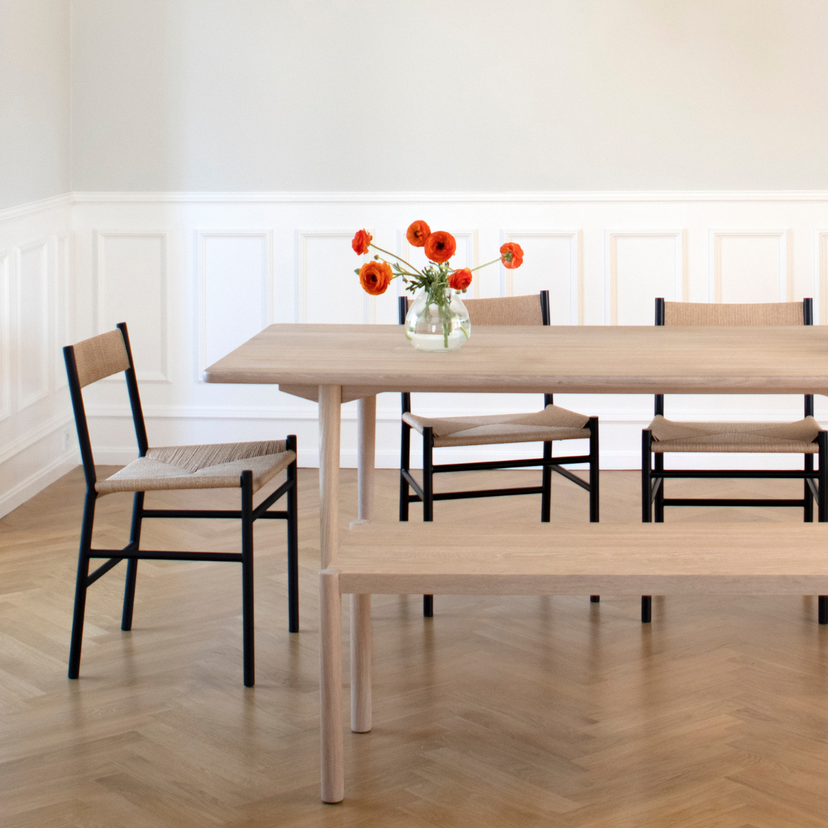 The furniture is made from recyclable, powder-coated steel. The chair’s backrest, seat, and armrests are handwoven in the traditional way using paper cord. When, many years from now, the furniture eventually reaches the end of its life, the cord and steel can easily be separated for sorting and recycling.