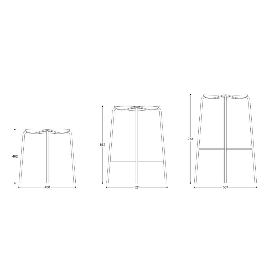The widest point of the bar stool and stool is the distance between the opposite legs. This means that the stool measures 48.8 cm in width at the widest point, the low bar stool measures 52.1 cm and the high bar stool measures 53.7 cm.