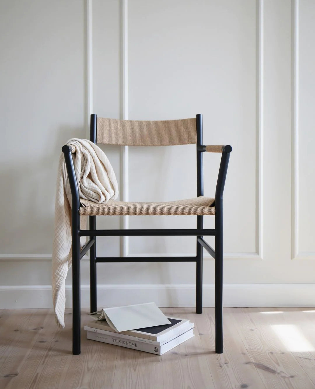 You can choose the chair with or without armrests, which gives you many options in your interior design. CORD is the perfect dining table chair, but it is also very useful in the office, in the entrance hall and in the bedroom. If you choose to use it at the dining table, you can advantageously combine chairs with and without armrests to create a varied look. The beautiful light wicker and the black contrast of the steel frame give you a chair that fits in most places.