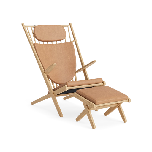 Choose between natural or black painted oak from FSC® certified forests (FSC® N002763). The look of the GOLIAT chair can also be varied with a choice of leather and textiles in several colours, so that it suits your particular home. Included are three cushions made of Oekotex®-certified cold foam with beautiful, removable wool or leather covers, as well as leather cords for attachment.